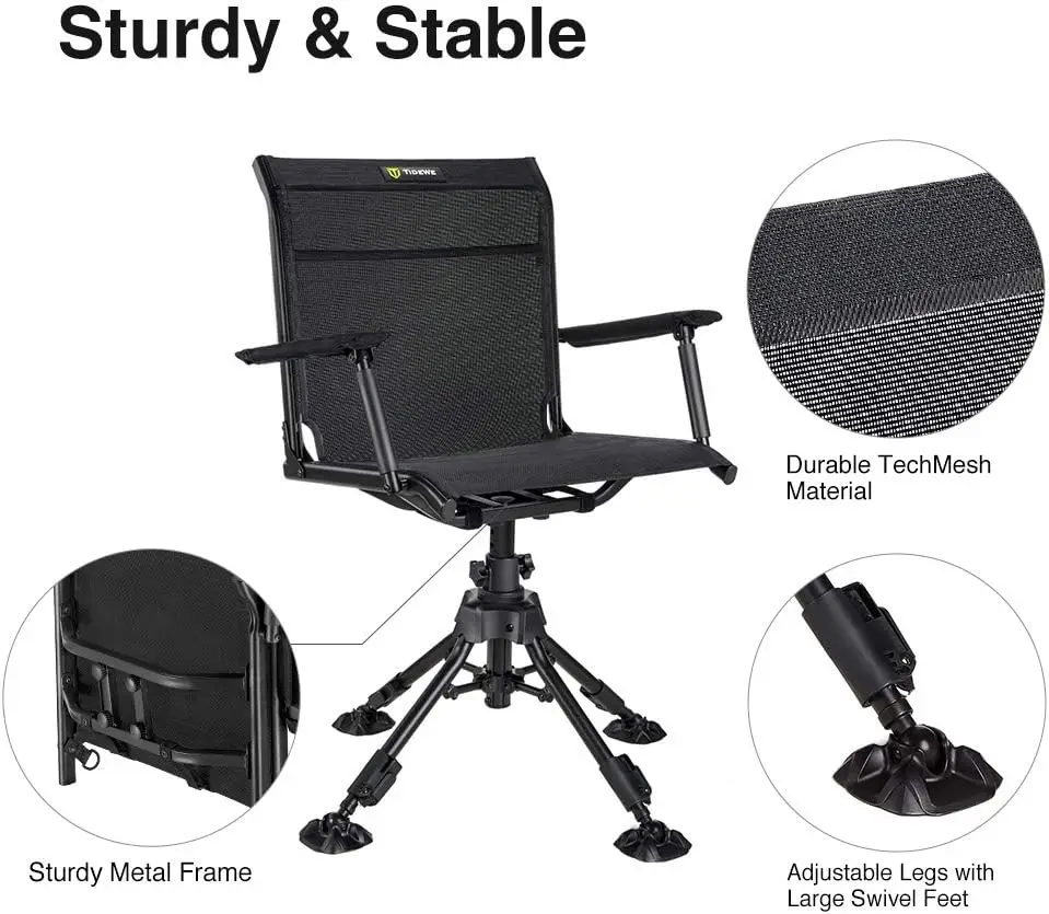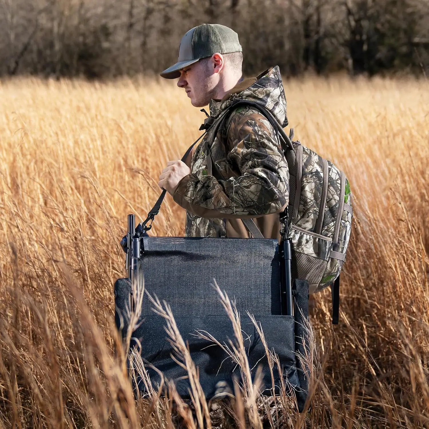 【Sturdy & Stable】 Sturdy metal frame wrapped with long-lasting TechMesh fabric material offers comfortable support. Independently adjust legs with the large swivel feet, allowing the hunting chair to remain stable and prevent sinking in soft ground.
